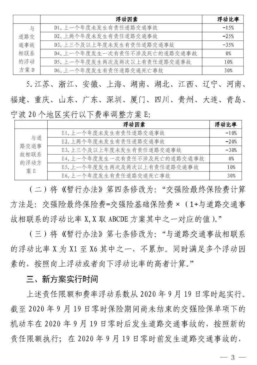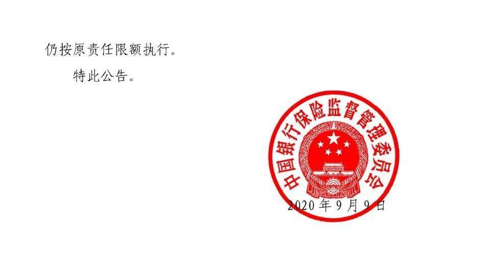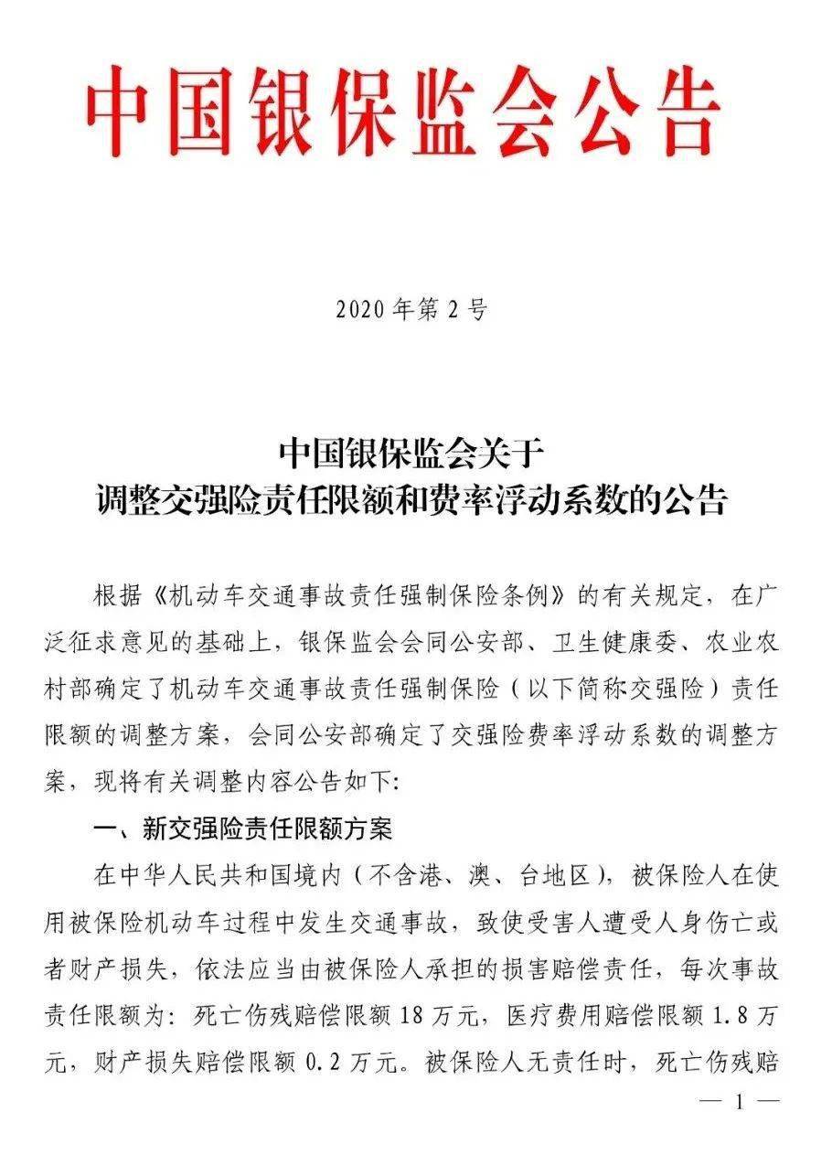 2020年9月9日,中国银保监会发布《关于调整交强险责任限额和费率浮动系数的公告》(2020年第2号),将于2020年9月19日正式实施。《公告》明确,2020年9月19日零时后发生道路交通事故的,新、老交强险保单均按照新的责任限额执行。